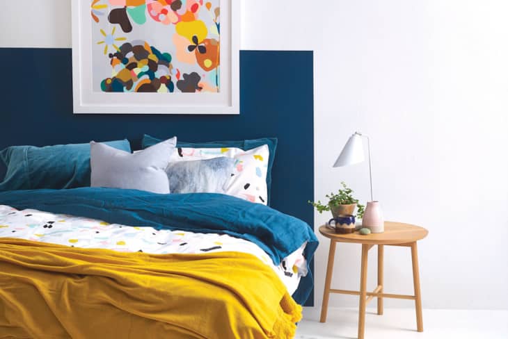 If your bed isn’t too high off the ground, you should have just enough paint to brush on a colorful headboard. Get inspired by Homestyle’s, above.