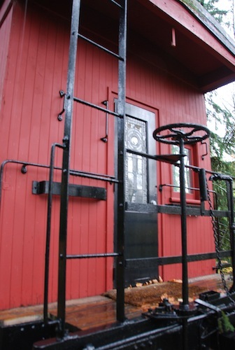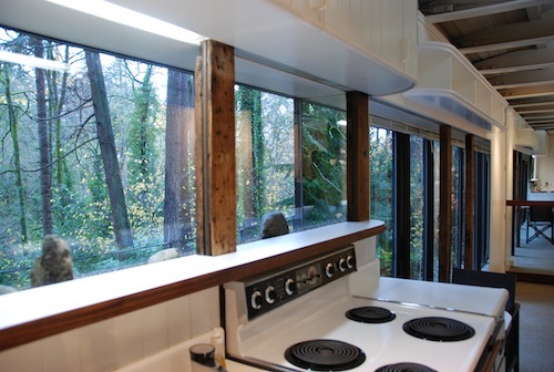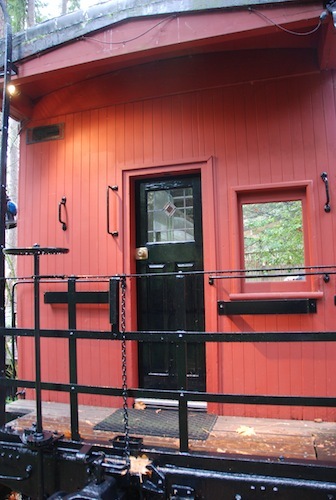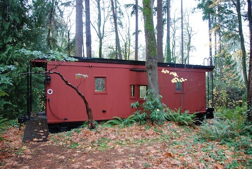 In the middle of beautiful Lake Washington, nestled amid four acres of wooded land, sits a tiny red caboose from 1949. Colorfully out of place among the giant evergreen trees and sprawling rhododendron, it’s a small jewel full of light and warmth. Full-height picture windows on one side overlook a large 8 foot by 20 foot private deck, all the better to take advantage of a sweeping western view of the wooded ravine and of Lake Washington. The railroad car sits on actual rails and serves as a live/work space for the Davidson family and for the occasional (and lucky) renter.