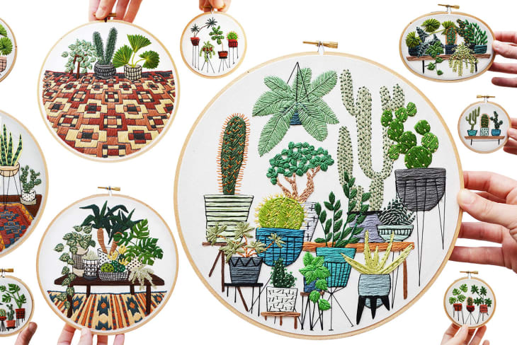 One of the artists at the forefront of the contemporary embroidery movement, Sarah Benning’s works start as illustrations before getting stitched with bright thread. Hey, plant lovers and mid-century modern enthusiasts, you won’t want to miss these designs.