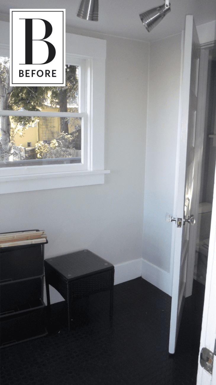 From Clara: My client just purchased a new home with a powder room on the main level that was less than stellar. There were some very unsafe stairs that led to the basement and an empty unused corner with no purpose.