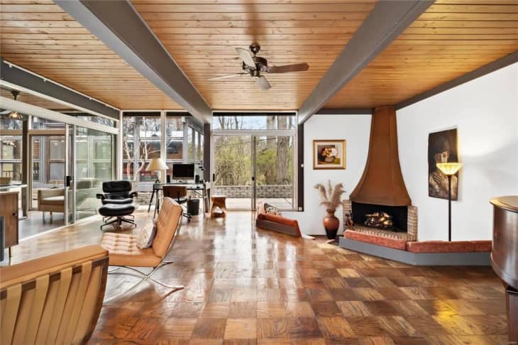 Built by architect Charles Kind, known for his MCM houses, this home is packed with appeal. Walls of floor-to-ceiling windows let in natural light and outdoor views, while a sunken seating area with a fireplace practically begs for you to lounge in it. In the back, you’ll find a huge patio and a screened-in sun porch—perfect for entertaining.