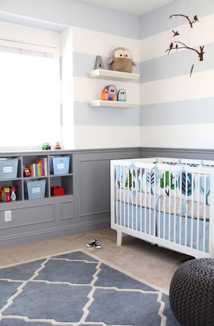 It has to be the walls. I am really happy with how the wide horizontal stripes, wainscoting, and the built-in shelves turned out. My husband installed all this. It was his very first time building wainscoting and built-in shelves and I think he did a really amazing job. I had a lot of fun drawing them out and shopping for molding. The shelves turned out to be at the perfect height for Aiden; he loves getting his books and toys from the shelves every day.
