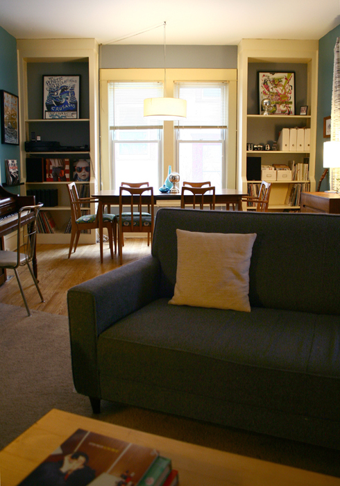 Favorite Element: The floor to ceiling bookshelves that flank our living/dining room space are a great place for displaying books, artwork, photographs, collections and records. It helps to make the space feel complete and organized.