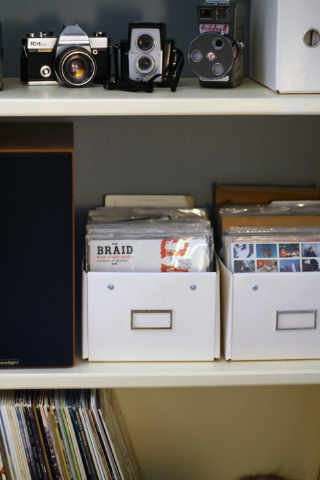 As you tour their home you’ll see Mid-Century influences from furniture to accessories. They’re mixed with pops of modern elements, artwork from friends and a record collection anyone would be lucky to own. We love the mixed chairs at the eat-in kitchen bar and the wall mounted desk — both are great uses of space!
