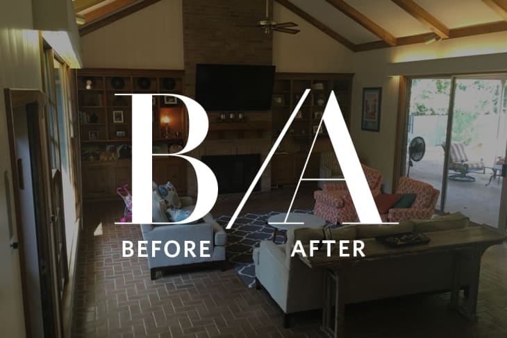 Lesley transformed this retro ’60s add-on room by toning down the color of the beams and ceiling fan blades with a deep grey/brown wash. She added doors to the built-ins and painted them a pretty grey, and completely redesigning the fireplace mantle from “unsightly Texas chunky” to “hey that’s a pretty mantle!”
