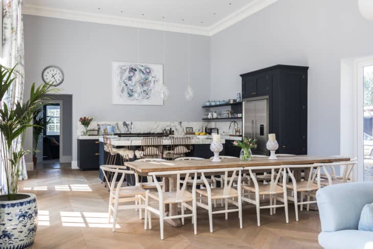 This kitchen above designed by Laura Butler-Madden, is very pretty, with deep blue cabinets, brass accents, and open shelving. It sits on one end of a huge, open concept great room with soaring ceilings and beautiful herringbone floors. But this room’s highest achievement may be achieving “peak kitchen island”. Let’s zoom in on it and discuss, shall we?