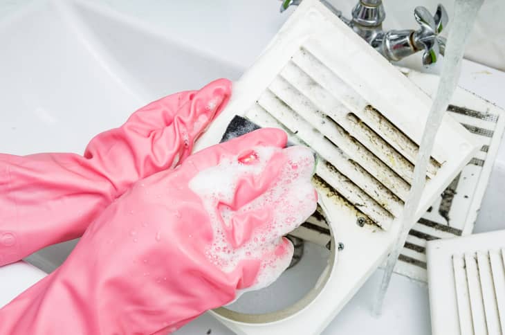 Pleshek notes that sticky substances, like hairspray and dry shampoo, can be like a velcro strip for dirt on your exhaust fan and vent cover. He recommends removing the vent cover, if possible, and washing it with a strong grease-targeting dish soap, such as Dawn Powerwash.