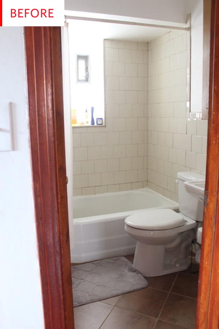 The tile, toilet, and tub are the same (at least so far), but the wall and floor have a dramatically different look. Sarah of The Surznick Common Room—@sawissinger on Instagram went big and bold with this affordable bathroom makeover, keeping all the basics intact and giving the floor, walls, and lights a major upgrade.