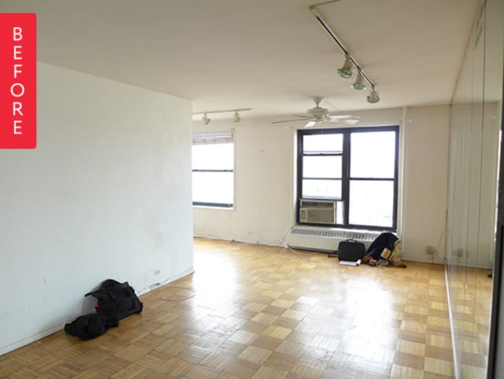 It may be hard to believe it, but this is, in fact, the same space (and the same angle, for you sticklers). The most dramatic change was opening up the previously separate kitchen to the living and dining areas, but the removal of the wall of mirrors and the addition of new, lighter wide-plank flooring also make a big difference.