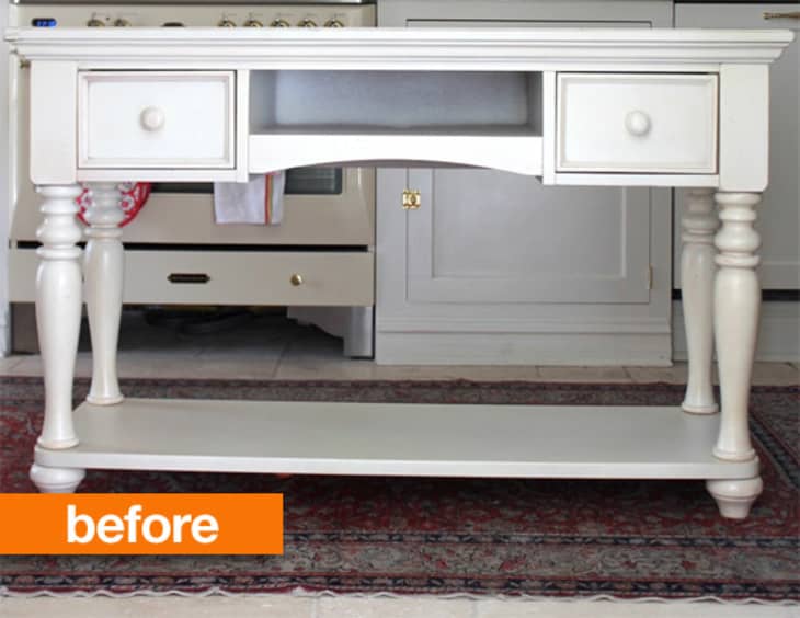 Once Liz started searching for an island with the proper measurements for her kitchen, she realized that such a specific size might require a custom solution. After deciding that her only option was likely a DIY solution, she and her visiting mom picked up a sofa table when shopping to serve as the base of her new island. The piece she found was the right width and length, but was a few inches shorter than she needed for a functional work space.
