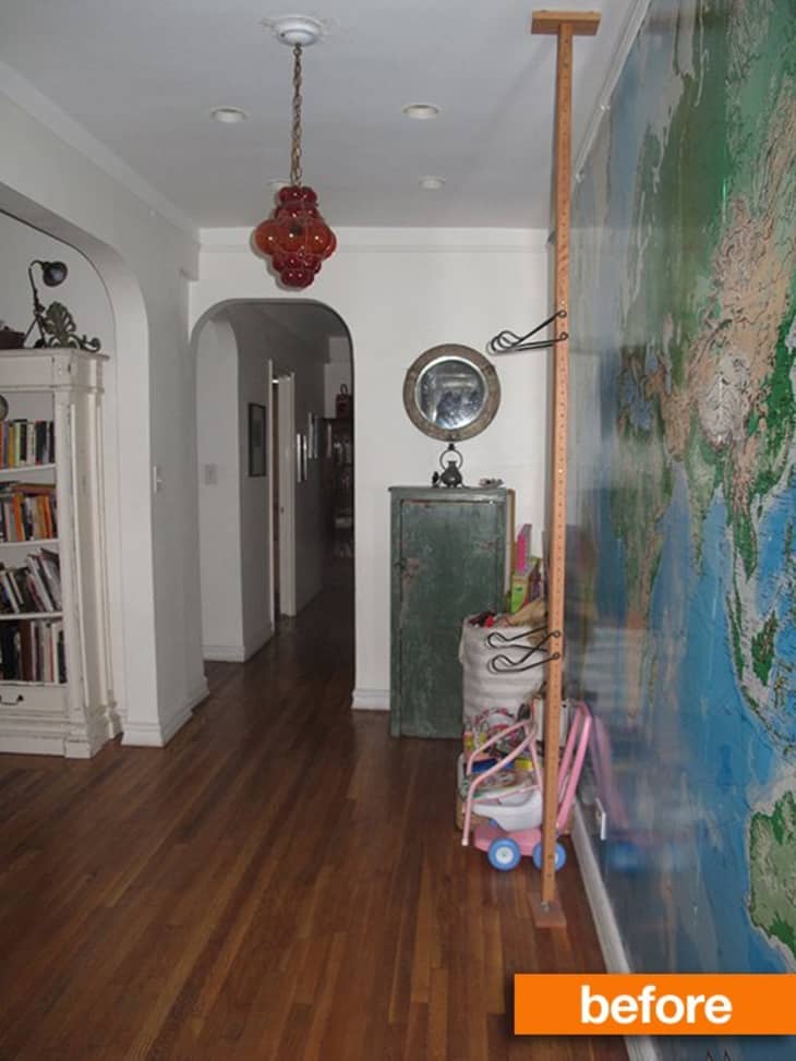 A series of smart and simple changes served to combine the two units, effectively and efficiently turning two homes into one. The wall separating the side-by-side hallways in the two apartments (the one with the giant map in the top photo) was torn down. The two hallways were combined to create a dining room, a much more efficient use of space.