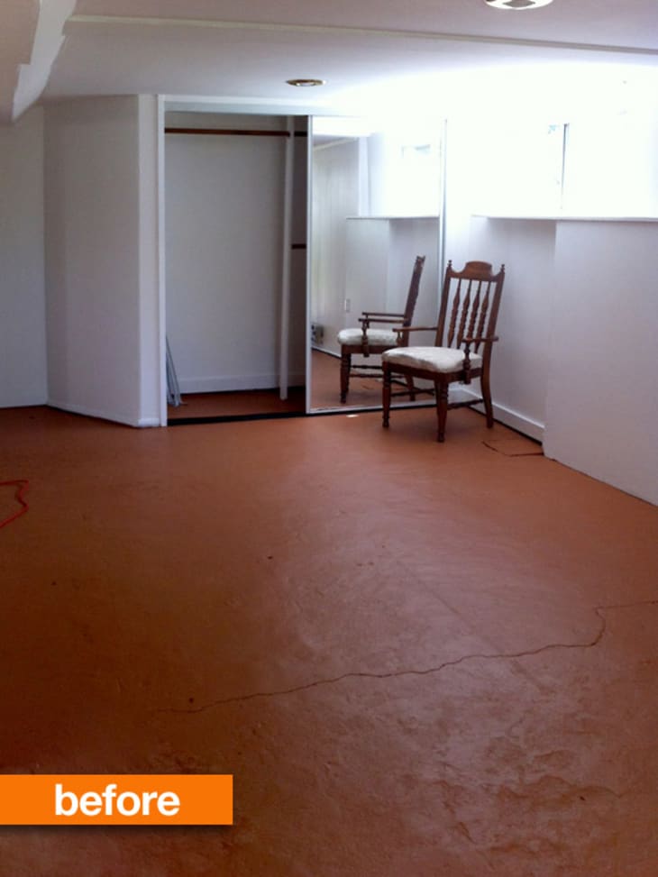 Dealing with this closet and salmon painted floor was high on the priority list of things to do to begin turning this basement into the modern family room it was destined to be. It had been on my mind since the moment we got the keys to the house. It took a few months to get around to it but we finally did. Follow me after the jump to see the result…