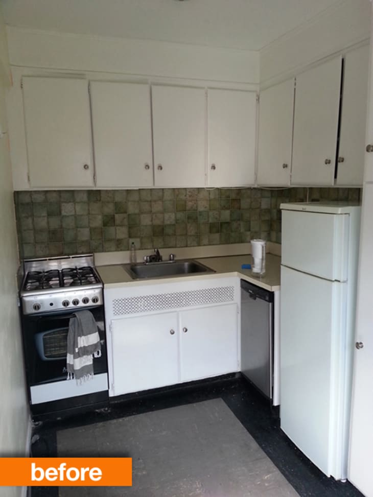 This is Lisa’s old kitchen — complete with tiny old stove, wonky old cabinets, and a backsplash in a particularly delightful shade of green. And then there’s the part you don’t see: hiding behind the sink cabinet is a big hole in the wall. This past summer, after having lived in the apartment for a year (and with her fancé about to move in), Lisa decided that it was time for a change.
