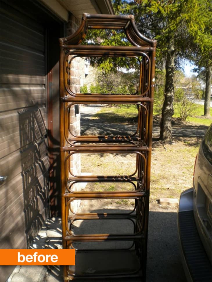 When Mel first saw this pair of bamboo shelving units in her Habitat for Humanity store, she passed them by without purchasing. She then spent the rest of the night worrying that someone else would have snapped them up; thankfully they were still at the store when she returned the following day. With their glass shelves and ornate lines, Mel just knew these pieces were perfect for a makeover.