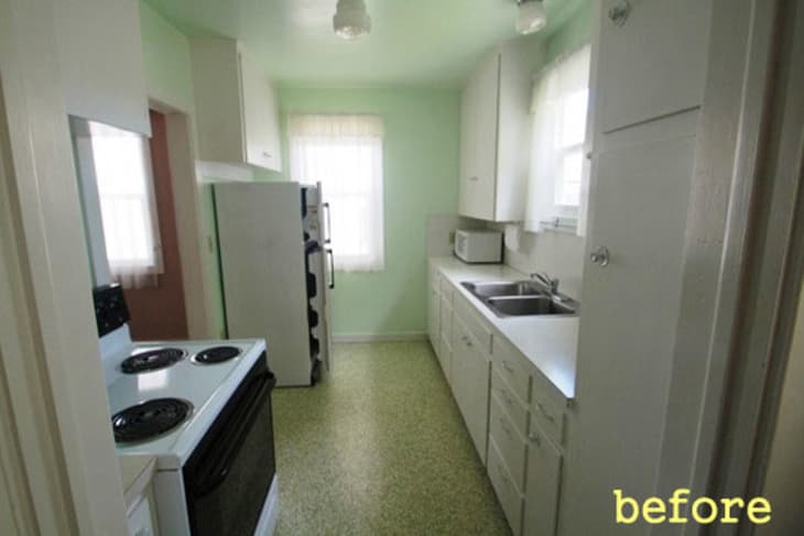 While Linn admits the green kitchen was kind of charming in its own way, she wanted a much brighter, cleaner and more efficient use of space. She achieved it in spades with the addition of a stainless steel counter, freshly painted cabinets with new hardware and white subway tile from floor to ceiling. The real stunner is the marble and granite floor tiles laid out in a diamond pattern, drawing the eye effortlessly down the room.