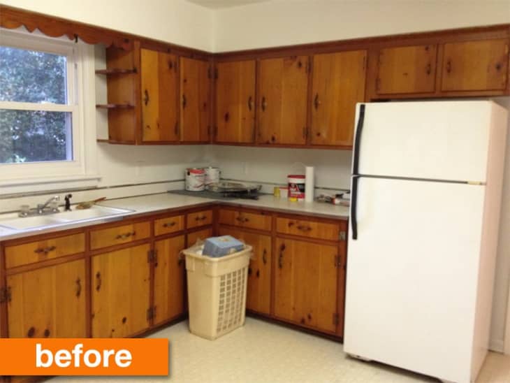 When Kelly and her husband moved into a 1950s fixer-upper in late 2012, they knew their kitchen — with original (in Kelly’s words, grime-encrusted) pine cabinets, aluminum-wrapped laminate counters and linoleum floors mixed with asbestos — would need some aesthetic upgrading. They even started working on this room two hours after closing on the house!