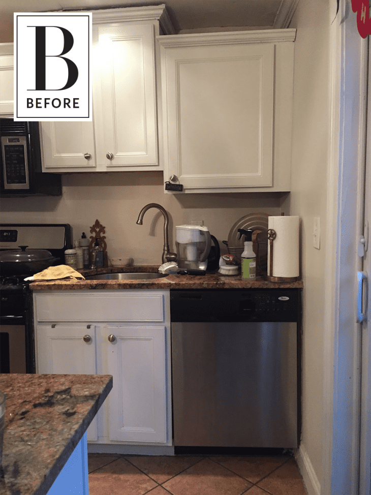 From Allie: When we moved into the house, the kitchen had brick-colored tile on the backsplash, orange and black speckled granite on the counters, and medium-toned wood colored cabinets. I knew immediately that we would need to renovate this if we planned to stay here for a while, but with our budget we couldn’t do everything right away. The first thing I did before we even unpacked our boxes was rip off the backsplash, patch any holes, and paint the walls white. About a year after this, I repainted all the cabinets white as well, which was a big undertaking as our small row home only has limited space to spread out.