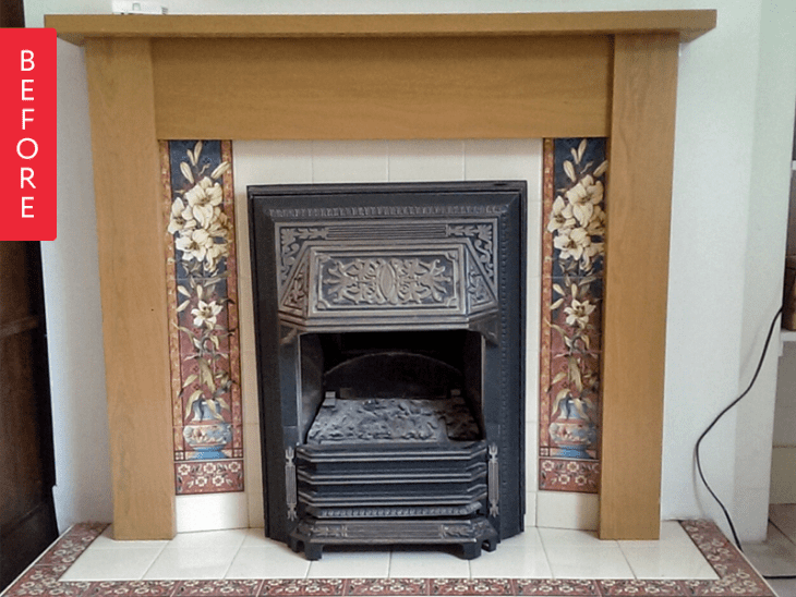 June’s fireplace had some dated features like fake wood and weird Victorian-esque floral tiles. She would have loved to replace the whole thing with her dream of a wood burning fireplace, but she didn’t have the budget for it right now. So she got creative and made the fireplace over with some paint, stencils and style!