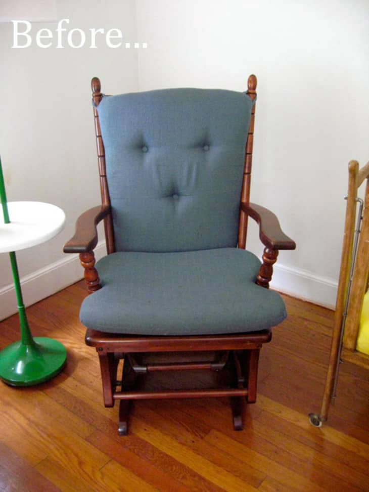 Madeline wrote us with not only a great Before & After to share, but a lovely story: I had done a lot of looking around online for inspiration for recovering old gliders and really didn’t find as much as I’d hoped. Now that my old glider has a fresh new look I was hoping it could be some inspiration for someone else out there. I know it looks like just any old grandmother’s glider but this one belonged to one of the coolest ladies who ever lived; it just had to be part my baby’s room. My dad dropped it off last week and despite the awesomeness of my grandmother the country blue fabric wasn’t cutting it.