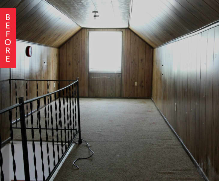 From Catherine & Bryan: We designed this space as a master bedroom. Aside from making it feel less dated, we wanted it to feel cozy, open, and full of character. We had talked about adding built-ins and cubbies, taking out the walls and widening the room, adding reading nooks – you name it, we thought of it. But at the end of the day, we had to be realistic about our budget and timeline, and ended up leaving the walls where they were. Instead, we transformed the existing space by removing the dropped ceiling, exposing the original beams, building a custom railing, replacing the grimy carpet, and painting. Take a look!