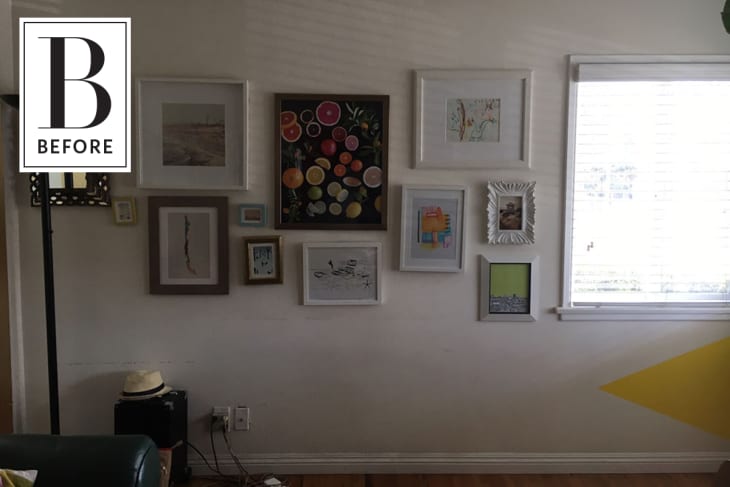 Mila participated in a recent round of the One Room Challenge, but didn’t want to get overwhelmed by a major hard-core makeover. So, instead, she chose to redo the single wall just inside her entryway, which is also part of her living room. As is, the space was fine, but she was bored with the current gallery wall of photos, and wanted instead to make it as impressive as possible with just a little work and money. Her goal for the end of the project? That this wall would scream with “greatness, sophistication, and happiness.”