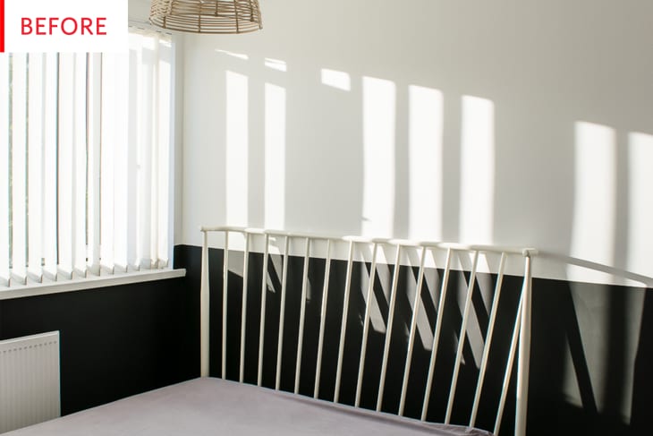 After she painted the walls a two-tone black and white (which you can see she started in the photos above), Medina filled the space with as much furniture as she dared to give them some amount of storage. Their king-size bed would only fit in one direction, so layouts were limited. Before you ask yourself, “why do they have such a large bed in such a small room,” know that Medina did raise the idea of scaling down, but her normally laid-back husband drew the line at this particular change. So, king-size they stayed.