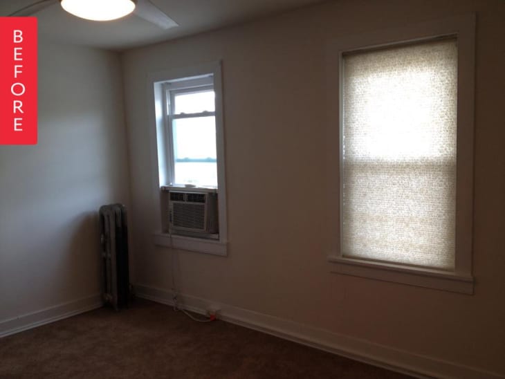 When we purchased our house two years ago, the only word that accurately described our bedroom was “depressing.” As you can see in the before photo, we were the proud owners of a clanking window unit, a rusty radiator, and one window shade— all contained within four drab, off-white walls. I forced a smile and tried to tell myself that it was a “blank canvas” not “utterly dreadful,” which was the phrase that really kept flitting through my mind.
