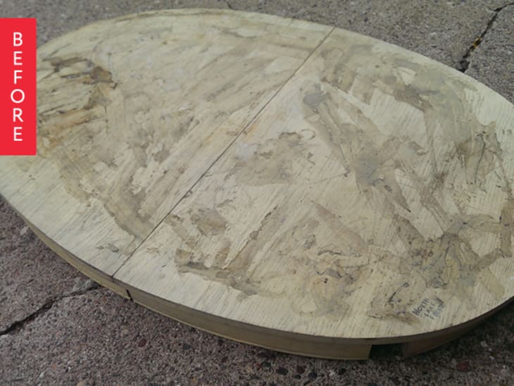 With a strange paste and layers of paint, this table looks almost unsalvageable. But Laura was determined to replace her card table on her student budget, and $5 was the right price. Cut to a week of sanding and staining, and you won’t believe how good it looks: