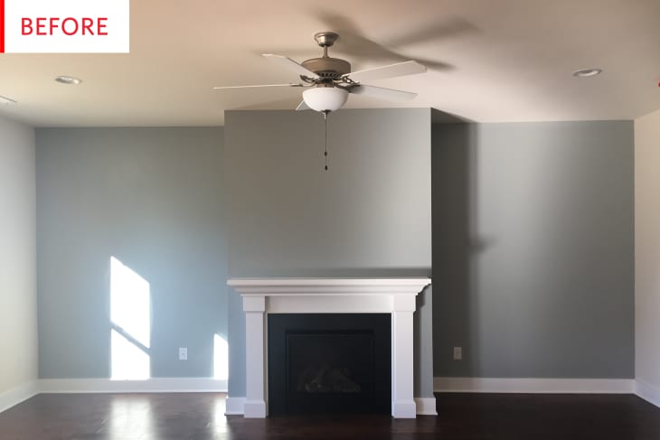 Here’s a room with beautiful bones—stunning wood floors, classic fireplace, tasteful paint colors, interesting accent wall, high ceilings—but can it be even better? Here’s how the homeowner kept everything that’s good about this room, while remedying the “big empty space!” next to the fireplace.
