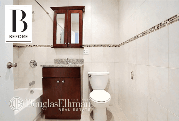 Structurally, there was nothing wrong with the bathroom in Nikki and Chris’ Astoria condo. Aesthetically, it looked a bit like an upscale gas station bathroom from the early 90s. The ‘after’, I think you’ll agree, is a huge improvement.