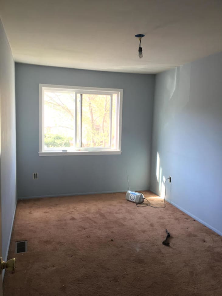 The first order of business: Tackling the bedroom. Specifically, the closet. Kate was lucky enough to have a huge closet space, but it didn’t offer much in the way of storage or style. Kate started by stripping the beige carpet and repainting the space:
