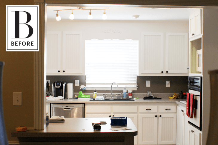 From Stephanie: The kitchen in our home was closed off, isolated and a mix of semi-updated and original features. We really hated that all of the natural light that came in through the kitchen widows was blocked off by a partial wall and that there were absolutely no sight lines from the kitchen to the main living spaces – a major concern for this mom of two kids under three.