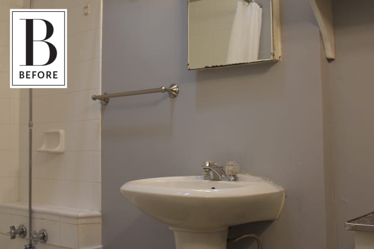 From Megan: The walls of our bathroom were decked in a puzzling color scheme with one brown wall and the rest purple. It was flat paint so it felt pretty dingy and not very practical in a bathroom. The overall arrangement wasn’t bad, but neither the sink, medicine cabinet, light fixture or vent were centered above each other. And most of the smaller fixture choices, like faucets and lights, were very cheap and dated. On one side of the room was a built-in vanity/storage situation, cheaply made with warped cabinetry and askew doors and drawers. It was topped with a formica countertop that didn’t really fit in with the era of the house, but I found it rather charming with its small flecks of pink throughout. Plus the idea of a built-in vanity was pretty great. Above the vanity was an off-centered light fixture (probably placed so it would’t be hit by the cabinet door), but it bugged me nonetheless. But the worst offender in my option was the beige floor. The color just made everything feel dirty and generally unappealing.