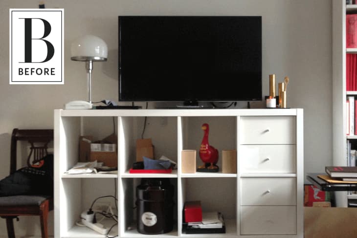 From Nick: A couple of years ago, my boyfriend and I lived in Queens, where we had enough room for a studio for my graphic design work. This bookcase used to live there and worked perfectly as is. It was just your run-of-the-mill IKEA Kallax bookcase in white with some drawer inserts.Once we moved into Manhattan, my working space had to move to the living room, so I needed to transform the bookcase into something I wouldn’t mind looking at in that space. There was also the need for hidden storage. Our new kitchen is tiny, so I wanted doors to hide the pots and pans that needed to be stored in it.