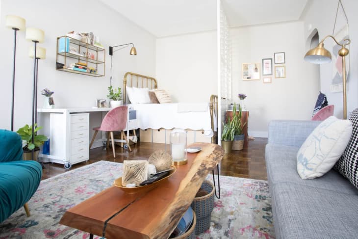 Believe it or not, one well-placed furniture item can turn an open layout living room into three unique spaces. Case in point: The bedside desk we saw in Elaine Burns’ 500 square foot Brooklyn studio. It divides the open living and bedroom space while creating bedside storage and a proper workspace.