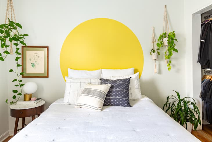 Similarly, these DC condo owners opted for white paint to make their bedroom feel larger, but they didn’t forget to bring the fun with a pop of yellow paint via a large painted circle on the wall behind their bed. The hue helps center the bed in the room, and once again, it serves as a minimalist solution to a traditional headboard.