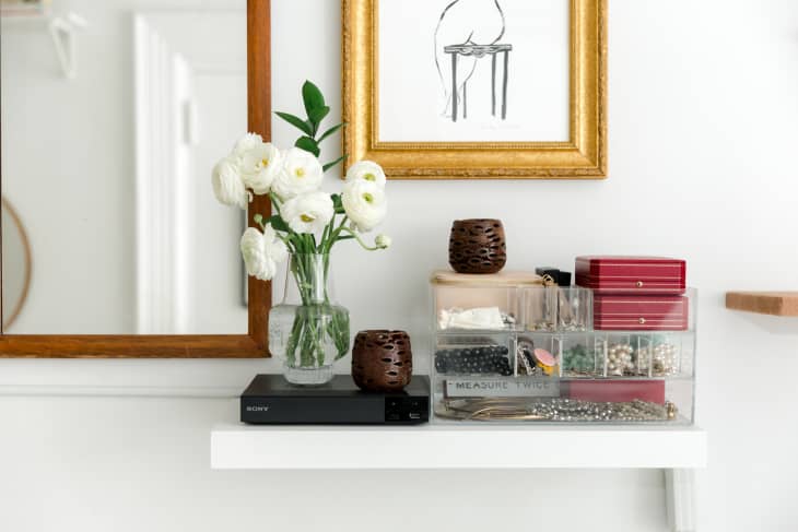 “Jewelry is one of the hardest things to keep organized, especially when you’re constantly changing out pieces for events and day-to-day wear,” says Brooke Spreckman, the founder and principal designer of Design Hutch. With this in mind, Spreckman says to look for small jewelry dishes, jewelry boxes with lids, or even containers with lids to keep jewelry “somewhat on display and organized.”