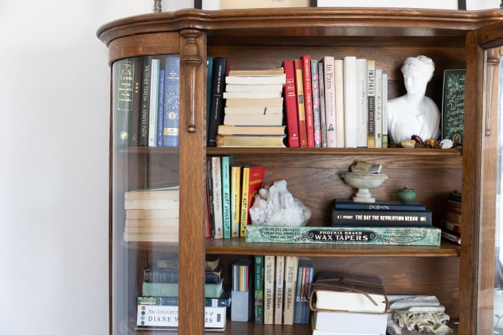 Your next step is to move the books around on your shelf to look their best. Sabrina Cohen, a professional interior designer and stylist with HiiGuru, suggests organizing the books by color, “with the larger books below the resting eye and smaller books where the eye would naturally rest when looking at the bookshelf.” She’d then organize hers by theme as well, but that’s a matter of preference.