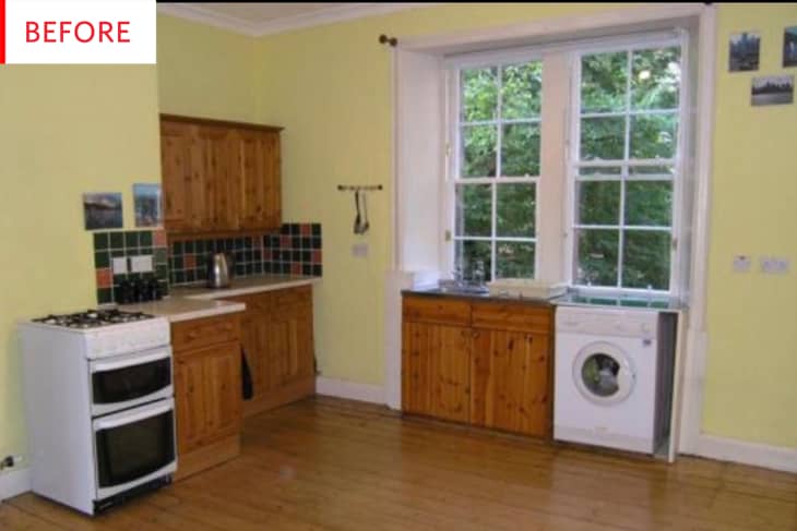 A quick glance at this photo might yield the following evaluation: great windows, beautiful wood floors, overall very nice (if a bit yellow)—it could perhaps use some flair. Reader Anne is here to set us straight on the fact that this kitchen needs a bit more than just a quick coat of paint…
