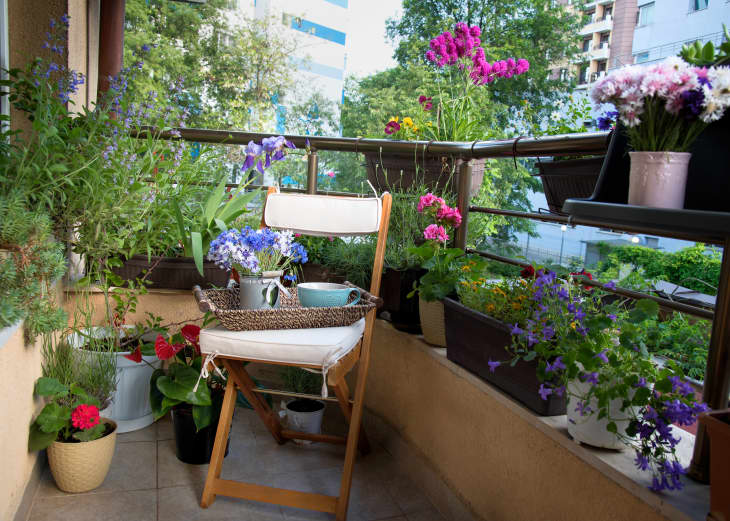 This patio combines potted plants, a vertical garden, and window boxes to make a space fit for high tea.