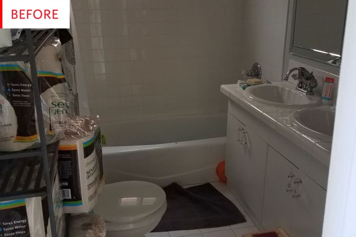 This bathroom had an awkward configuration: having the toilet opposite the sink makes for a narrow walkway and an overall crowded feeling. And while I salute the residents for their bulk-buying and stockpiling, the full shelves only add to that crowded look and feel.