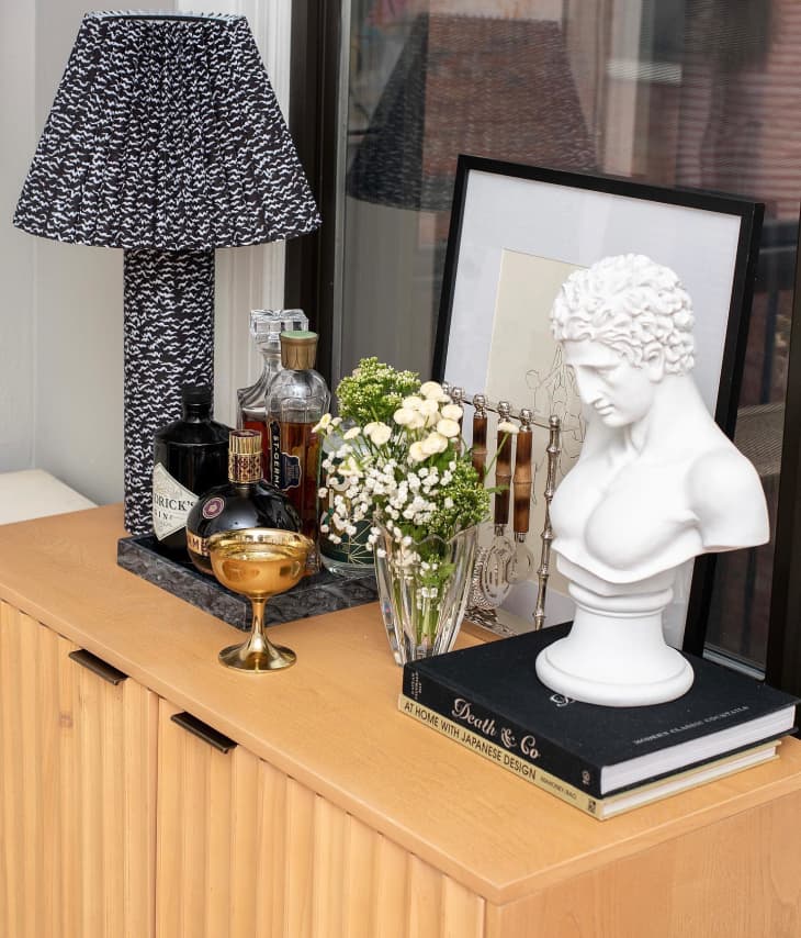 This lamp is one of my favorite CB2 purchases ever and has since moved with me to my New York apartment, where I continue to receive compliments on the piece (you can see it on my bar cabinet at the top of the story, but I’ve also used it elsewhere). I’m pretty sure some people have mistaken it for a one-of-a kind find, and that’s probably because of the pattern-on-pattern design. The squiggly, composition notebook-esque pattern of the base also graces the shade, which makes the piece so unique among other home decor store lamp options. The pattern also makes the lamp a style chameleon, in my opinion. It can read as ’80s post-modern, maximalist, or more vintage eclectic meets traditional, which is how I have it styled. It’s nice knowing that if my home design aesthetic changed a bit, this piece would probably still fit in.