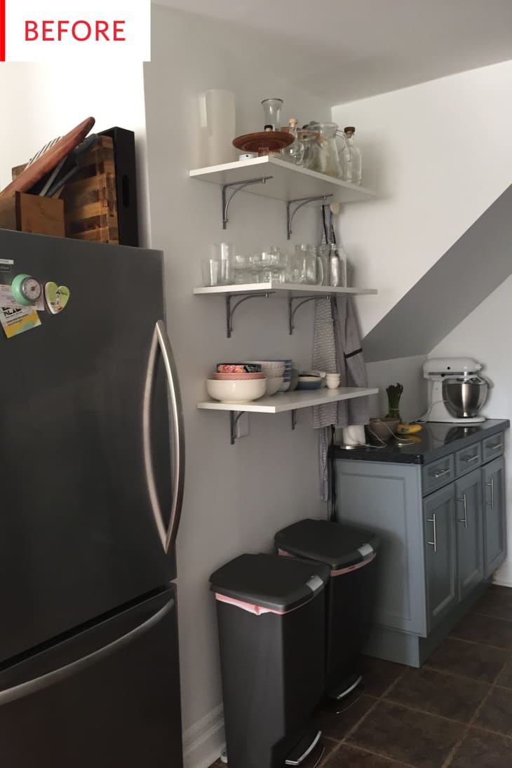 Finally we have this shelf unit next to the kitchen. While it was certainly providing crucial storage space for a ton of dishes and other cooking supplies, it added a bit of a jumble to the living area.
