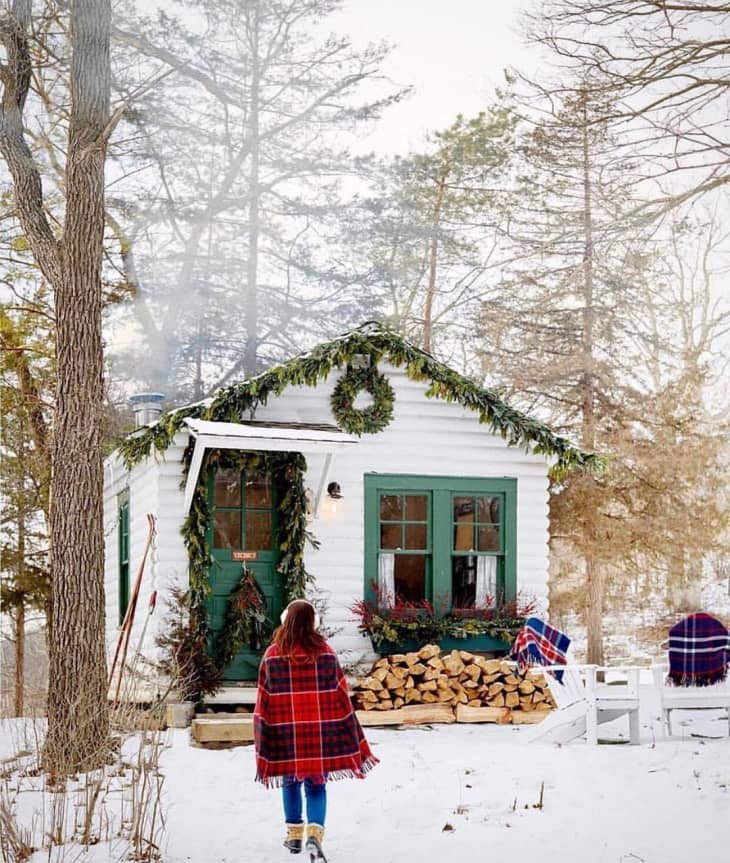Above: Wouldn’t you just love to come home to a place like this? The door, eaves, and even the window boxes of this little home from Camp Wandawega (via their Instagram) are decked with greenery, for maximum holiday cheer.