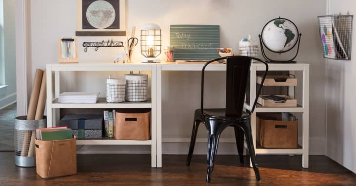 “I love this collection because it has something for everyone and every workspace,” Joanna tells A Bullseye View. “The wooden pencil holder and two-tier paper tray are great for desktop storage, while the pivot world globe and lined chalkboard will add elements of nostalgia and personality to any creative space.”
