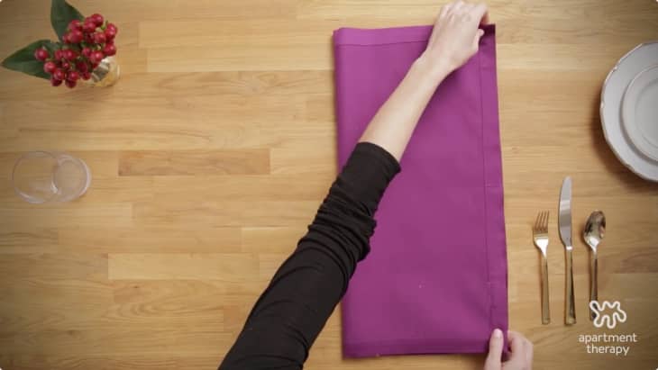 Interior designer Slay Kanadikirik shared the super easy hack on her TikTok page, transforming a standard linen napkin into an adorable mini tree that can stand upright on each table setting or lay flat. You start by folding the napkin in half, and then a second time so it’s shaped like a square and features four layers on the corner—the corners should all line up with each other and it will appear to be a diamond shape. You then fold each corner on the outer layer towards the inner layer one at a time, making sure to keep everything smooth as you go.