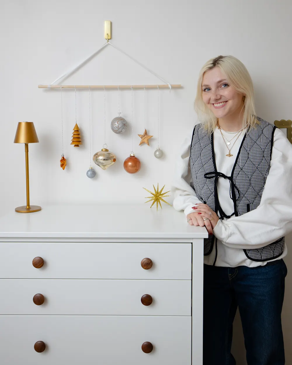 “I haven’t really paid much attention to decorating my bedroom for the holidays in the past, and it’s a pretty minimalist space right now,” Emma says. “This project added a lovely pop of sparkle and shine to the space that I didn’t know I needed.” Here’s how it came together.