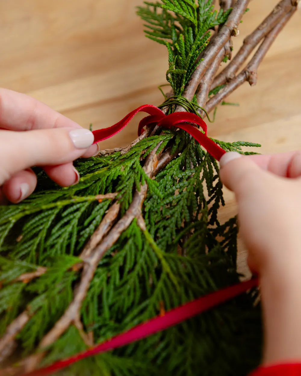 This year, that includes a DIY swag wreath to adorn the workspace of her Brooklyn apartment. A swag wreath consists of a simple bundle of branches rather than a shaped form, giving a classic antique style moment. And when you hang them with Command™ Brand Hooks, they’re also simple to take down without harming your walls or paint! Command™ Brand Products feature a damage-free adhesive that gives you a strong hold when you need it and a clean break when you’re done. Here’s how Sarah made her swag wreath.