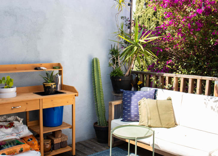 Installing a semipermanent sunshade has more than one advantage. When Katie Falbo (@highboyla) hung this sunshade hooked with bungee cords to exterior walls, she created an outdoor living space that is both protected from the heat of the sun and also the elements. That meant she could bring in indoor-outdoor moments, like a rug, textiles, and decor, adding more life to a small outdoor oasis in the city.