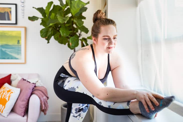 The hamstring muscles (located on the backs of the thighs) can be tight even if you’re not working out regularly, says Fetters. Place one leg up on a sturdy chair, couch armrest, or windowsill. Pull your arms long over your head and then lead forward, stretching towards your outstretched foot. “It’s important to lead with the torso and the chest as opposed to leading with the arms and then rounding your back,” says Fetters. The chest should be down towards the thigh of the stretched leg and the back flat. You can also do this sitting on the floor, with one foot tucked in resting inside the thigh of the outstretched leg, says Fetters.